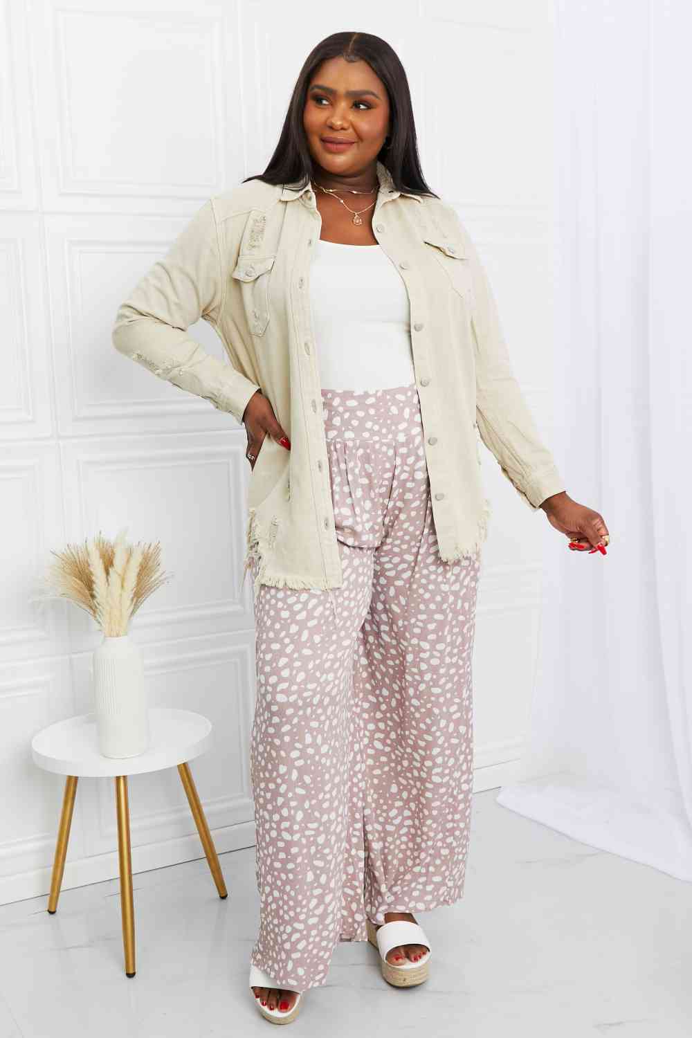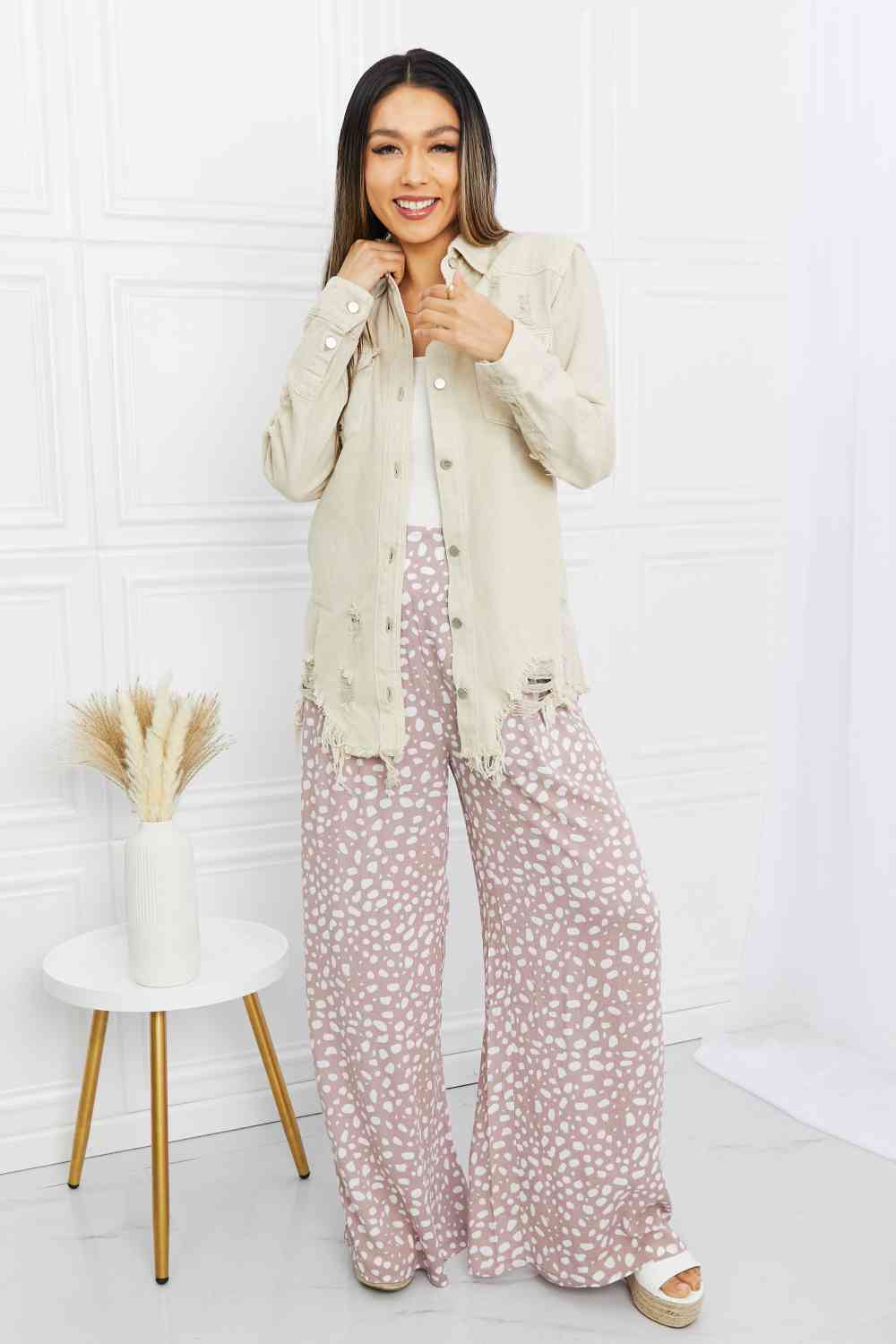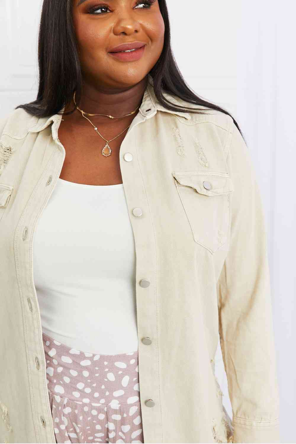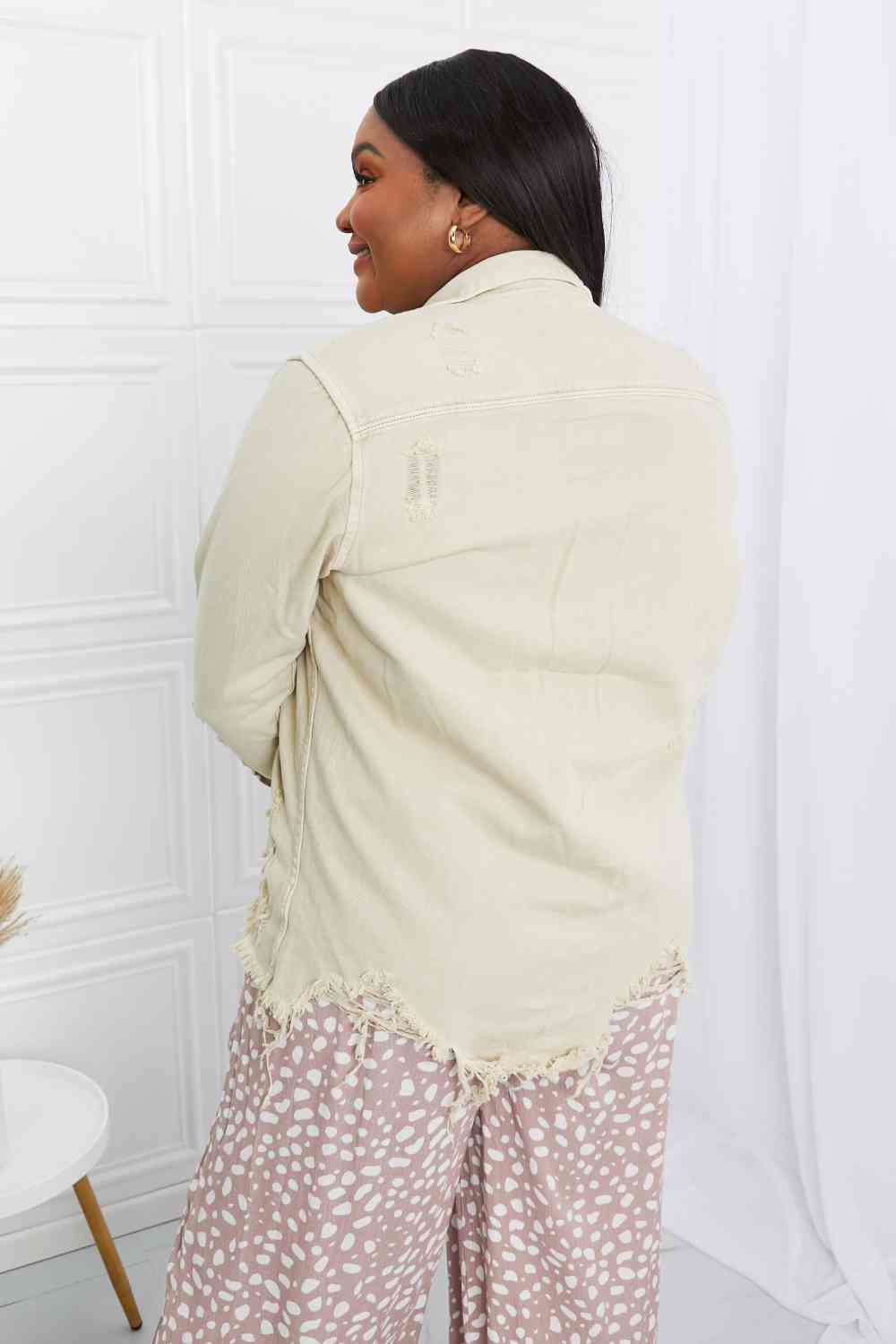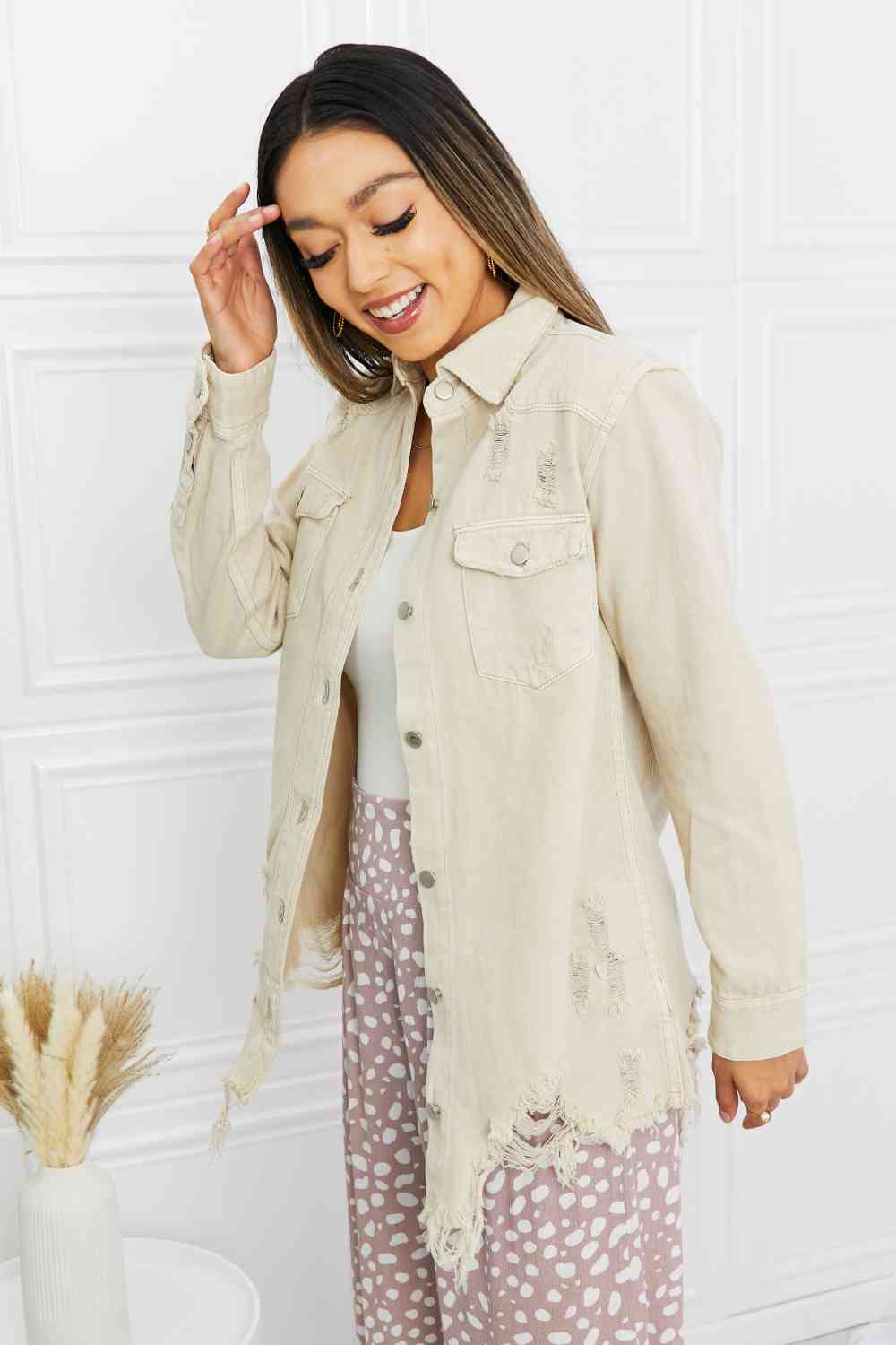 This distressed denim jacket is the perfect piece for your casual wardrobe. Featuring button closures and long sleeves, this jacket will look great with a pair of jeans or leggings.