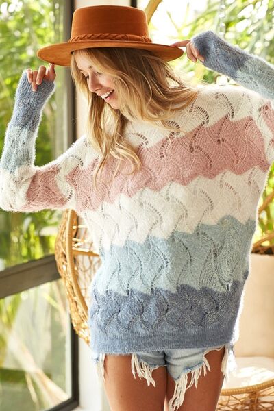 The color block openwork long sleeve sweater is a trendy and stylish choice that adds a touch of modernity to your outfit. With its unique color block design and openwork detailing, it offers a chic and contemporary look. Crafted from a soft and breathable fabric, this sweater provides both comfort and style. The long sleeves provide extra coverage and warmth, making it perfect for cooler days. Whether worn on its own as a statement piece or layered over a camisole or tank top for a layered look, this sweater effortlessly combines fashion and versatility. Embrace the allure of the color block openwork long sleeve sweater and let it elevate your style with its fashionable design.