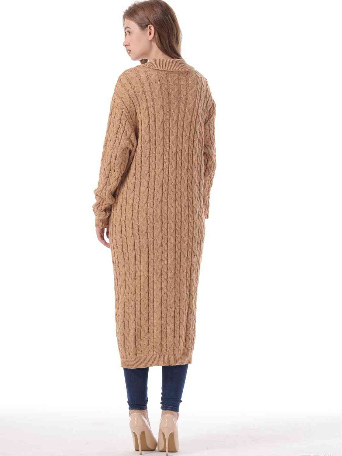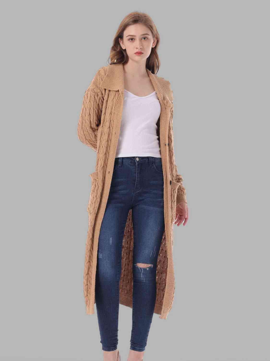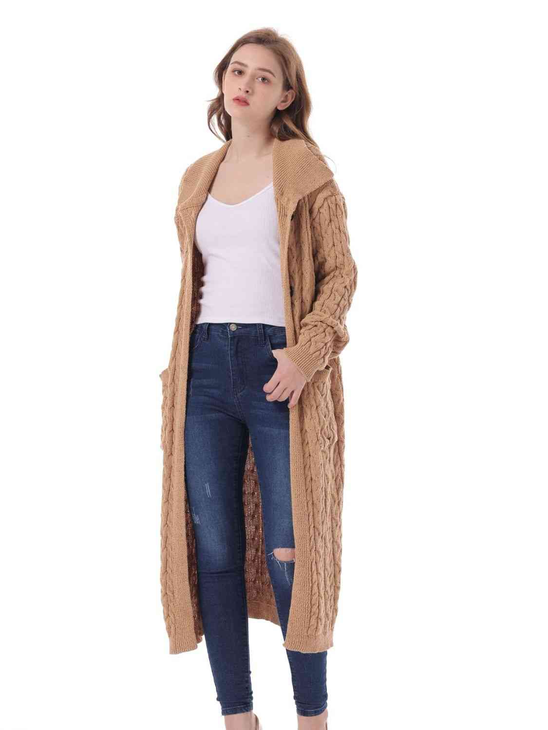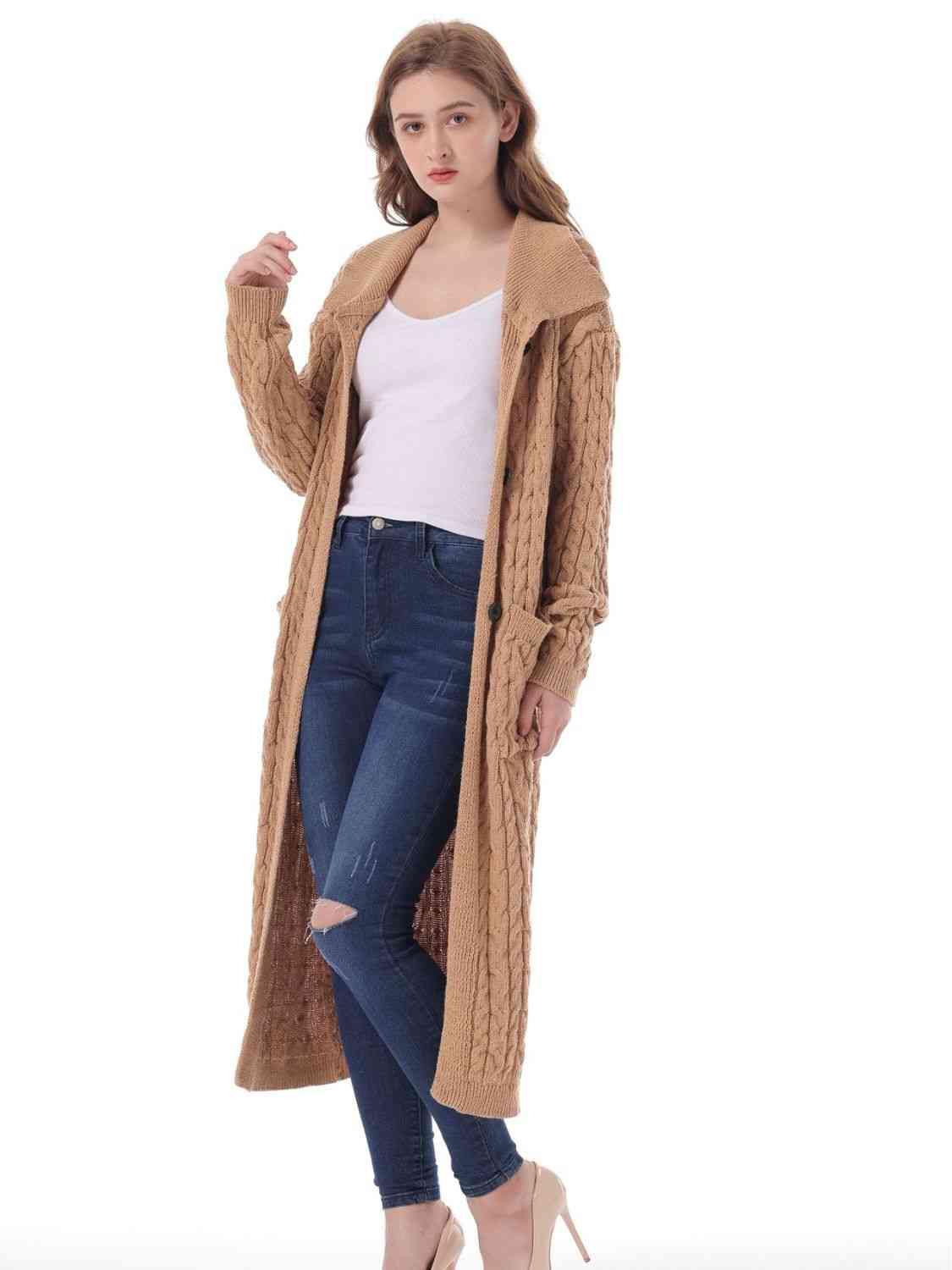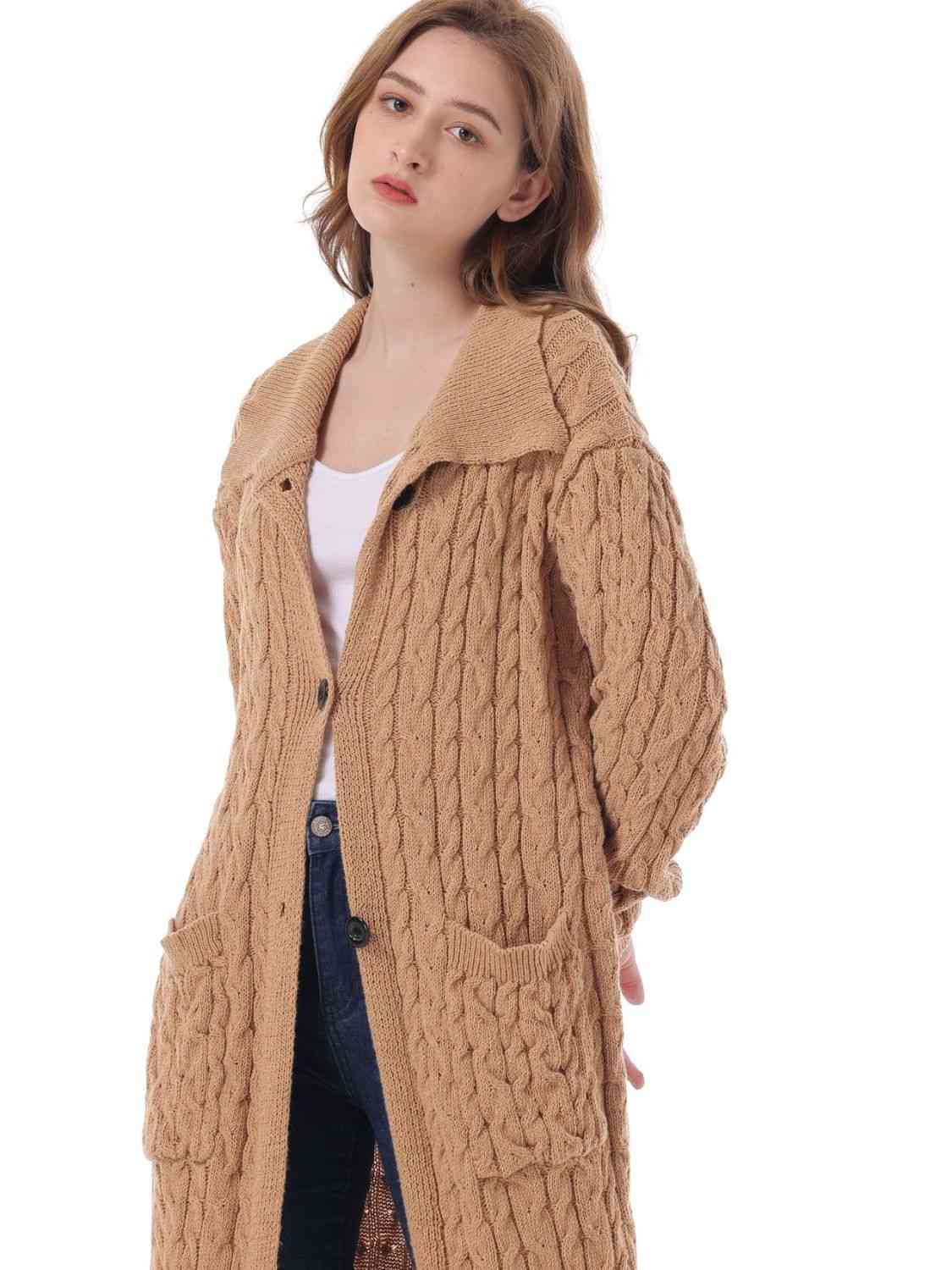 Cable-Knit Collared Neck Cardigan with Pockets