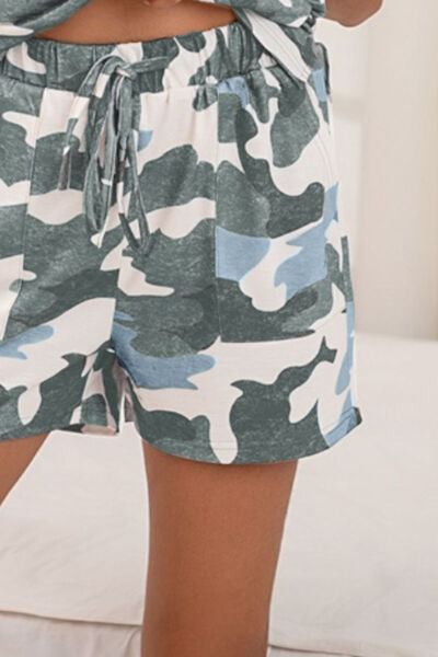 Camouflage V-Neck Top and Drawstring Shorts Lounge Set