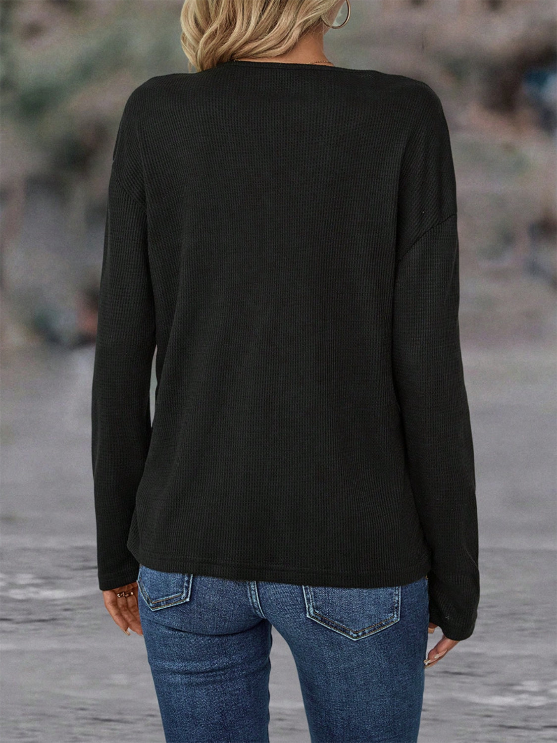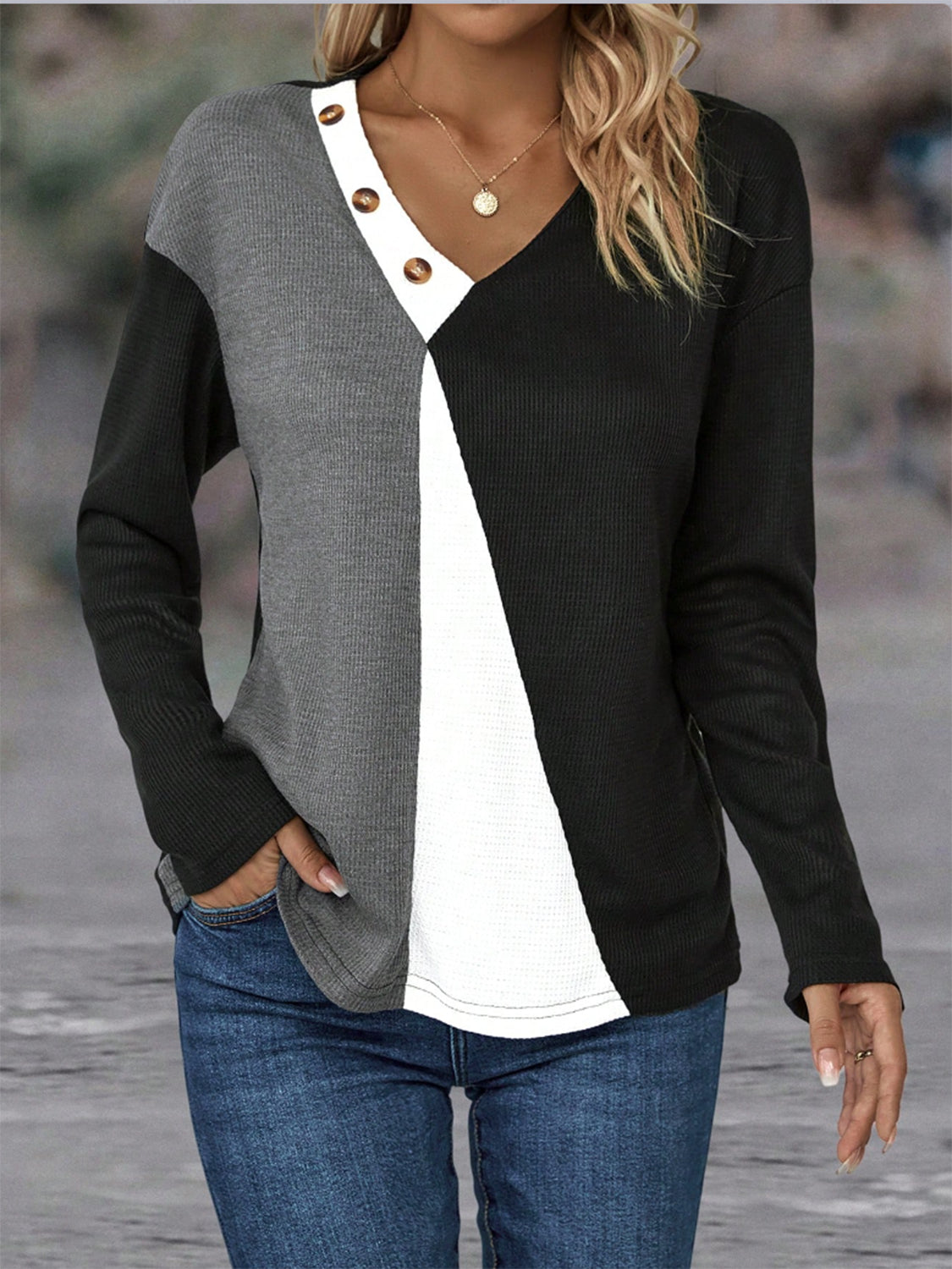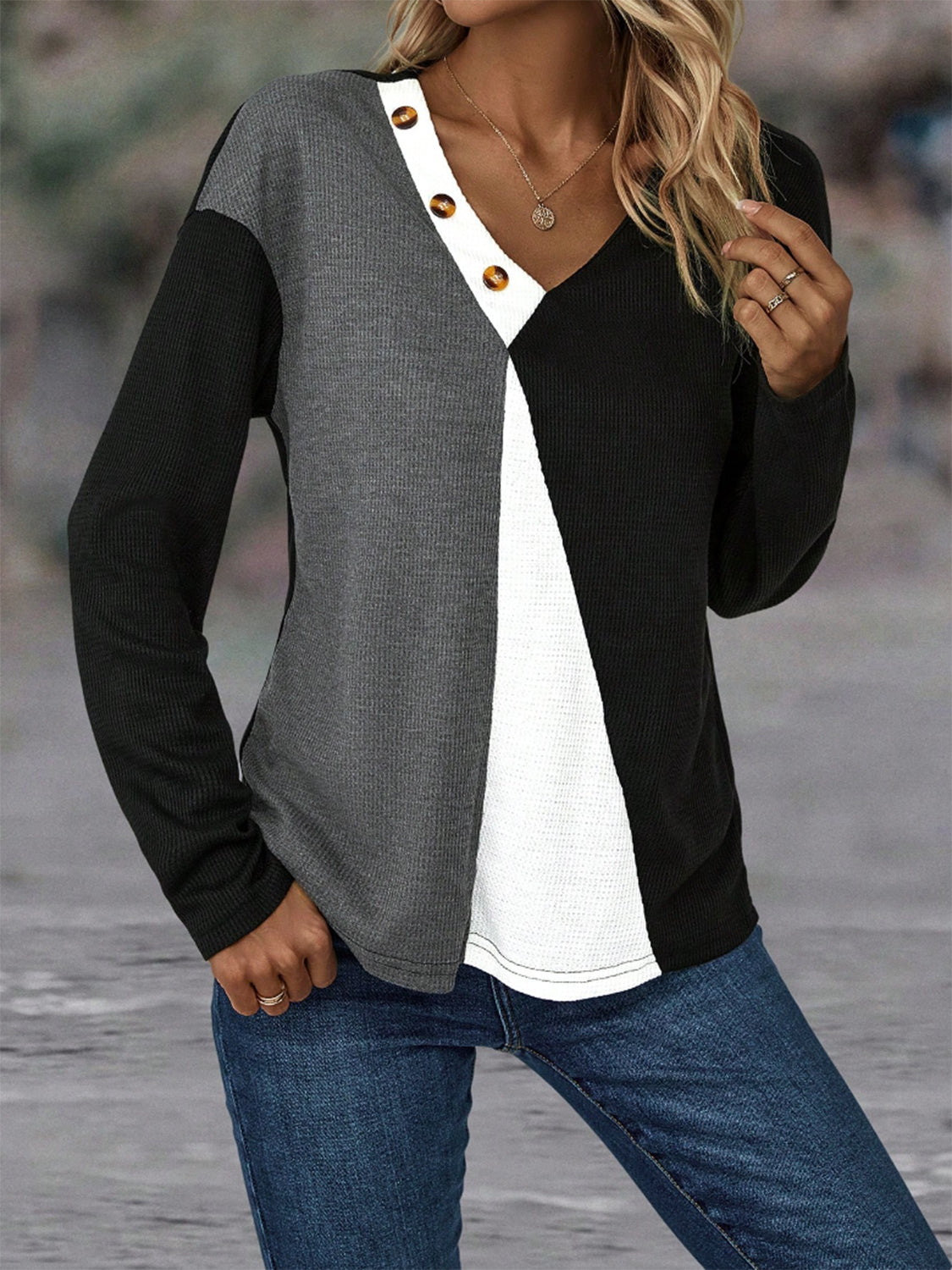 Color Block Decorative Button V-Neck Top