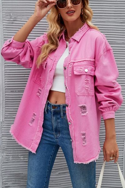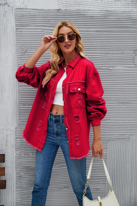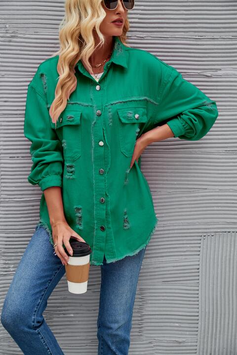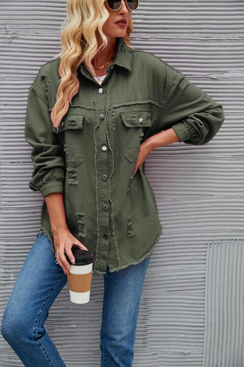 Features: Distressed, Buttoned, Pocketed, Raw hem Closure type: Single-breasted Stretch: No stretch Material composition: 65% cotton, 35% polyester Care instructions:...