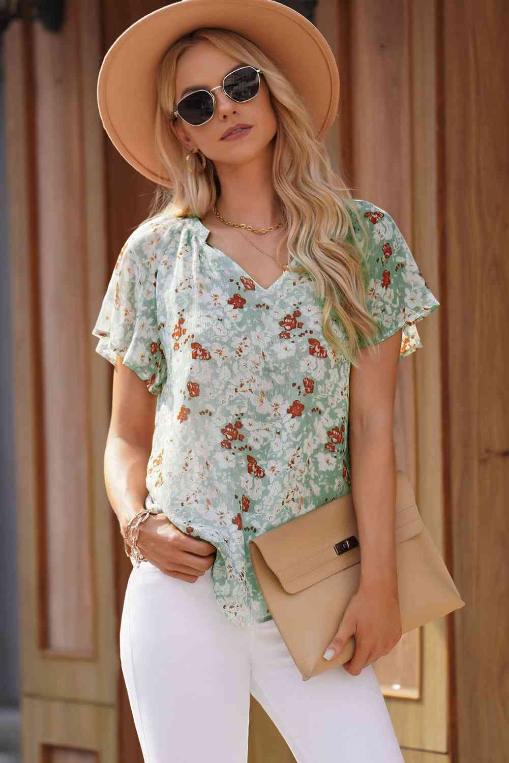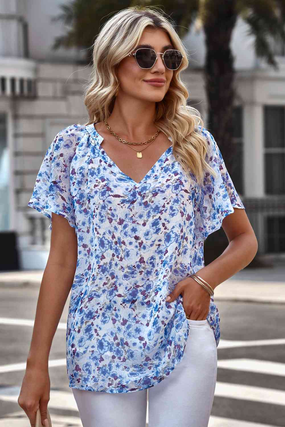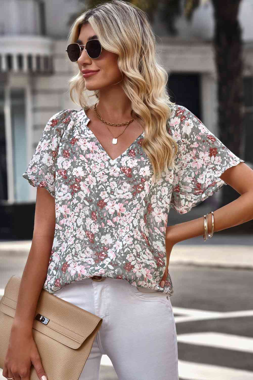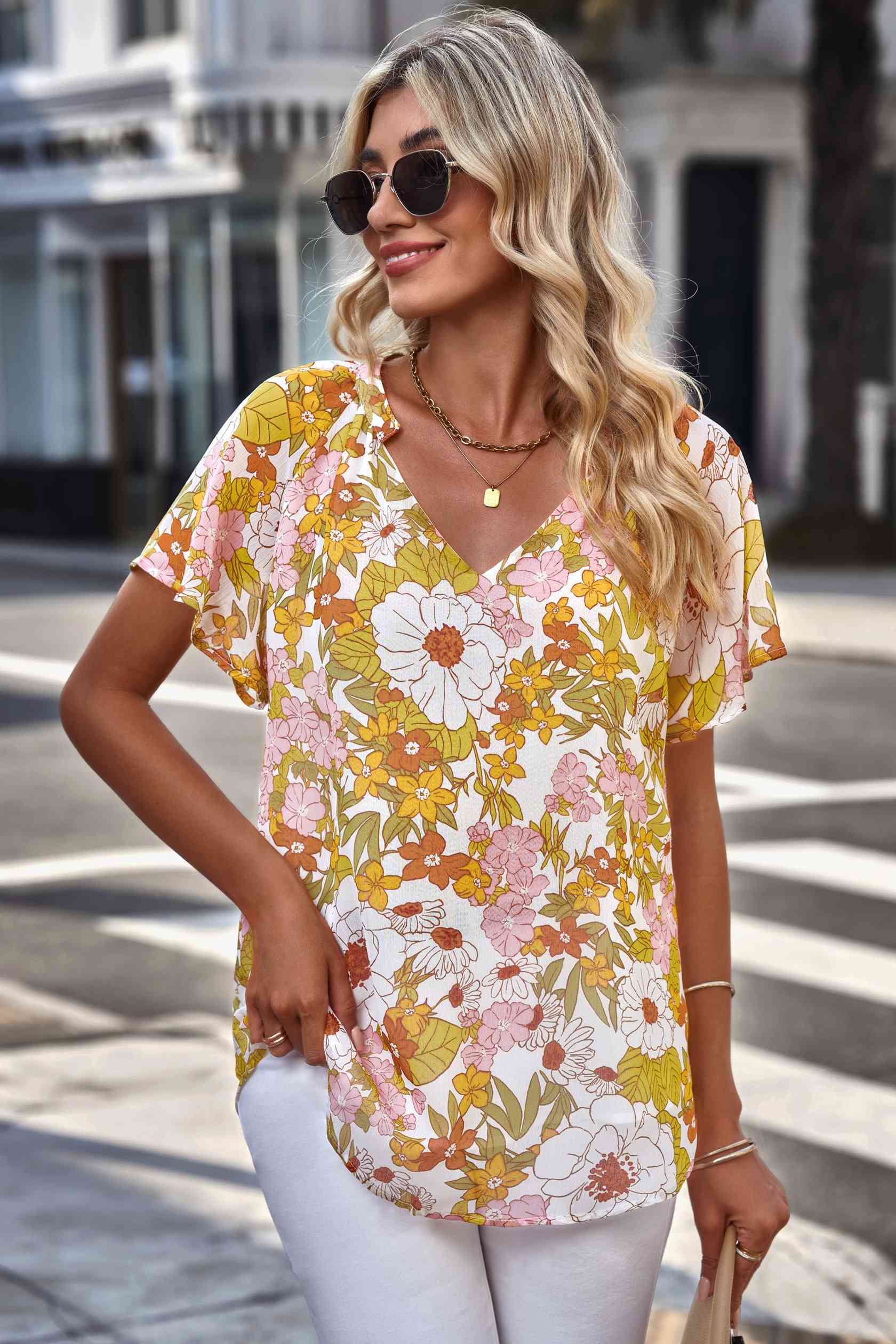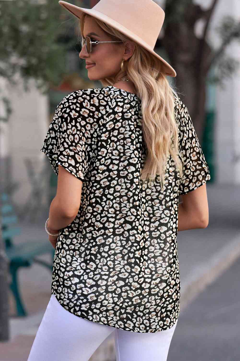 Pattern type: Floral, Leopard Style: Casual Features: Basic style Neckline: V-neck Length: Long Sleeve length: Short sleeves Sleeve type: Flutter...