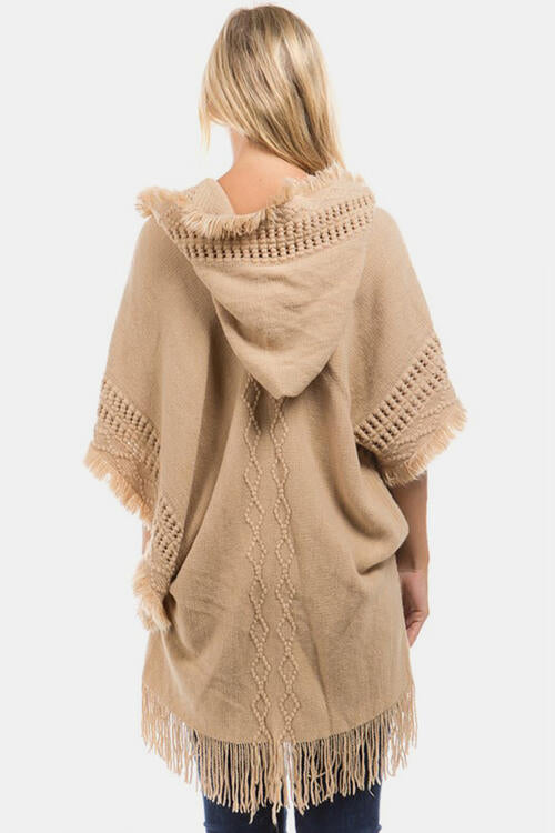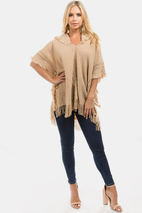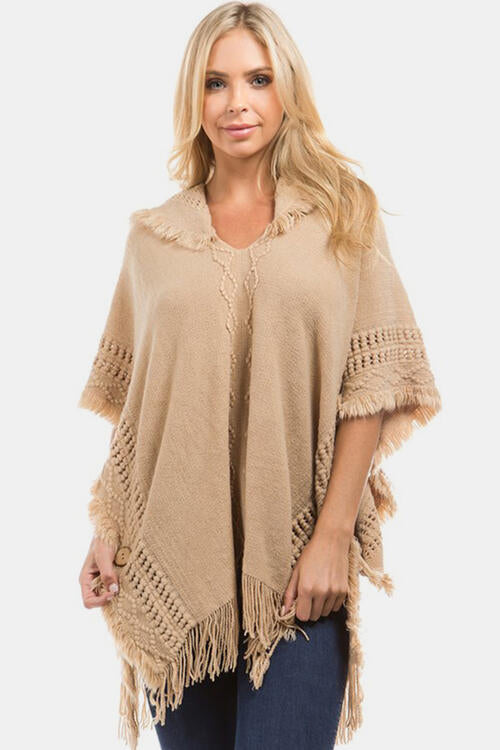 Fringed Crochet Buttoned Hooded Poncho