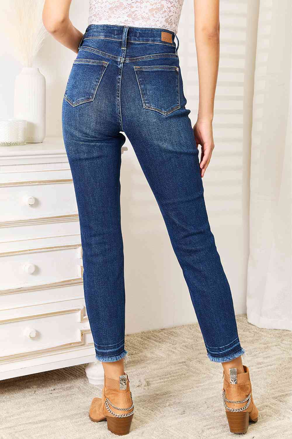 These jeans feature a rich, deep indigo wash that exudes sophistication, making them versatile for any occasion. With a high waist design, they offer a flattering fit and a slim silhouette, enhancing your curves while providing all-day comfort. The released hem adds a subtle touch of edginess without distressing, making them suitable for both casual and semi-formal settings.