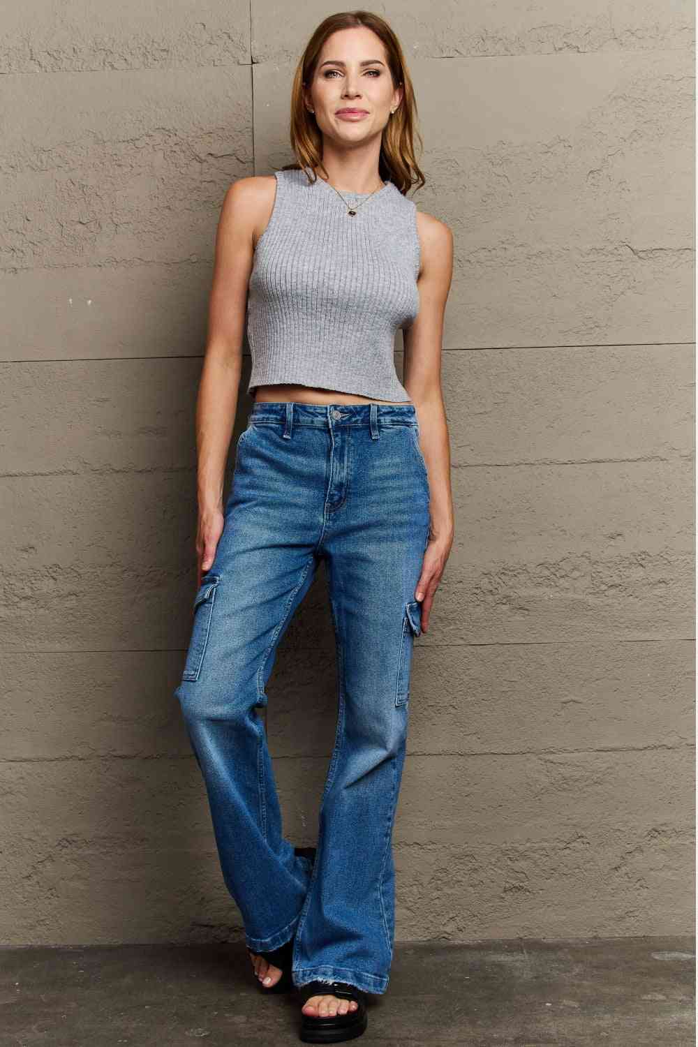 These jeans feature a comfortable stretch that ensures a flattering fit all day long. The high rise design offers a trendy and versatile look, while the zip fly adds convenience. Complete with slanted front pockets and cargo detailing, these jeans are not only fashionable but also practical, providing ample space for your essentials. Upgrade your denim collection with these cargo flare jeans that effortlessly combine fashion and functionality.
