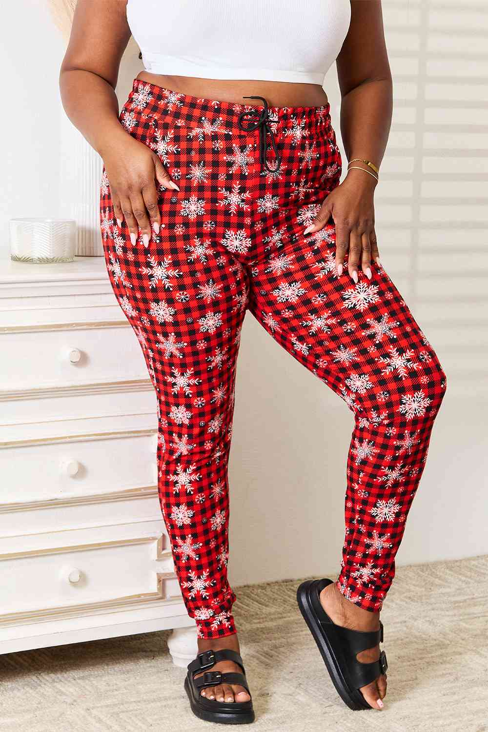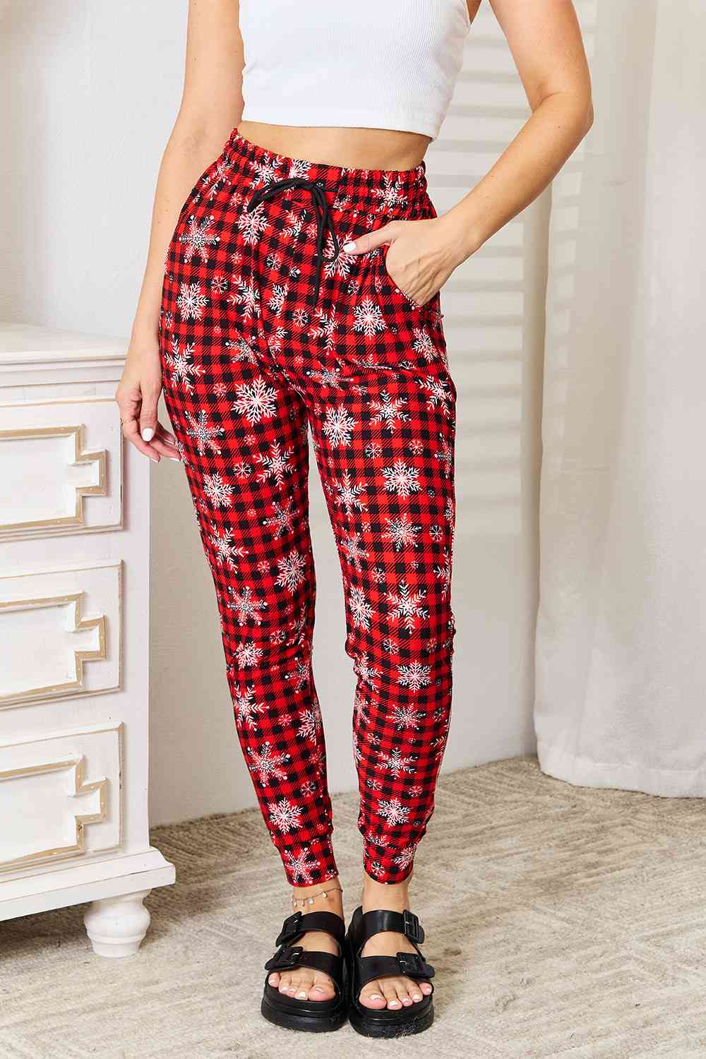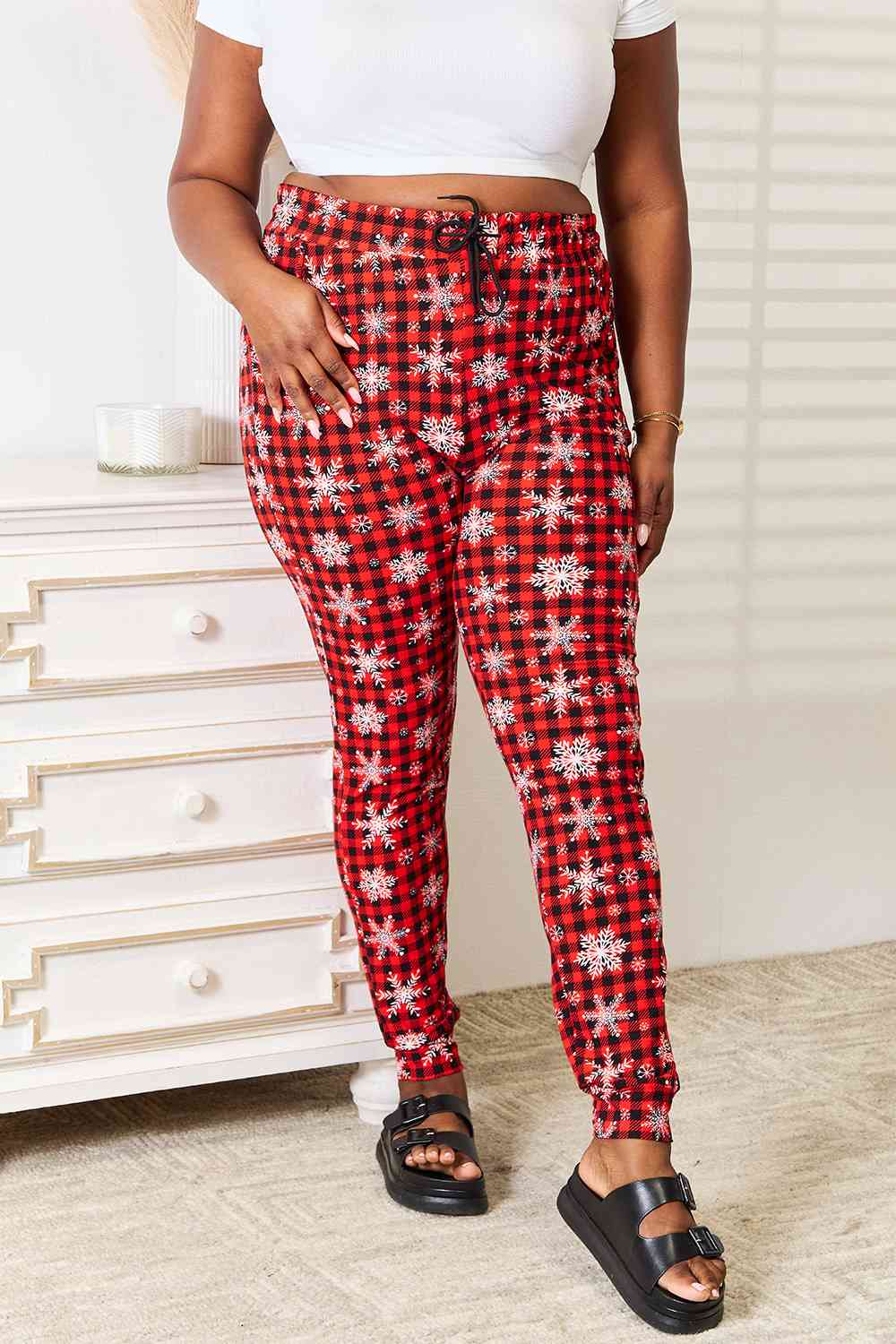 These joggers feature a delightful holiday-themed print that adds a touch of merriment to your wardrobe. The solid trim enhances the overall look, making these joggers suitable for both casual outings and cozy nights.