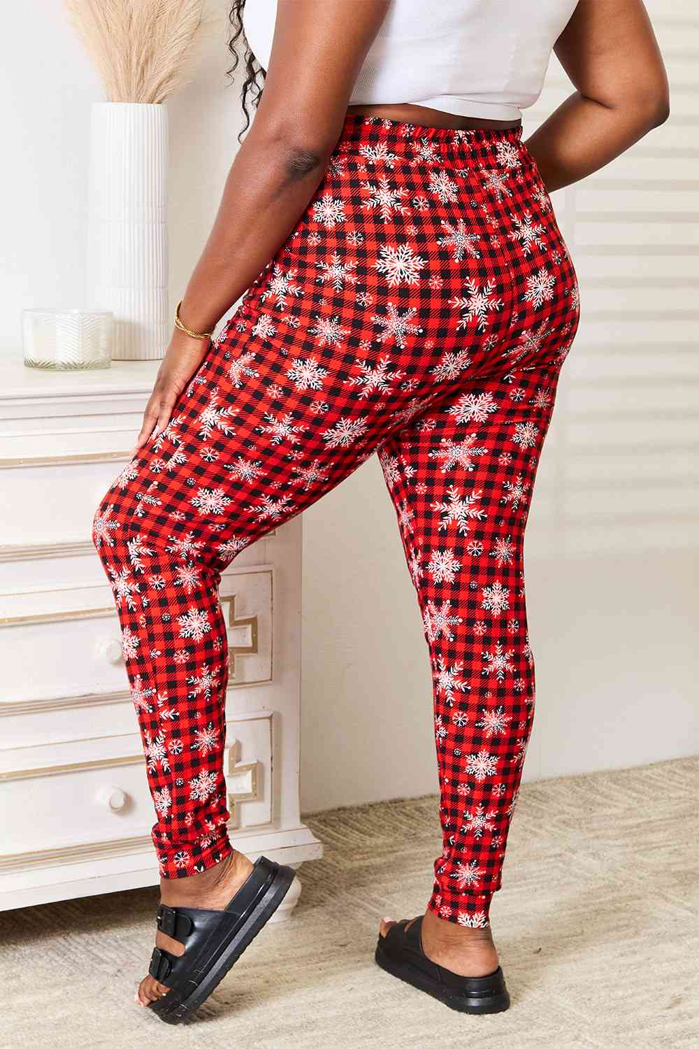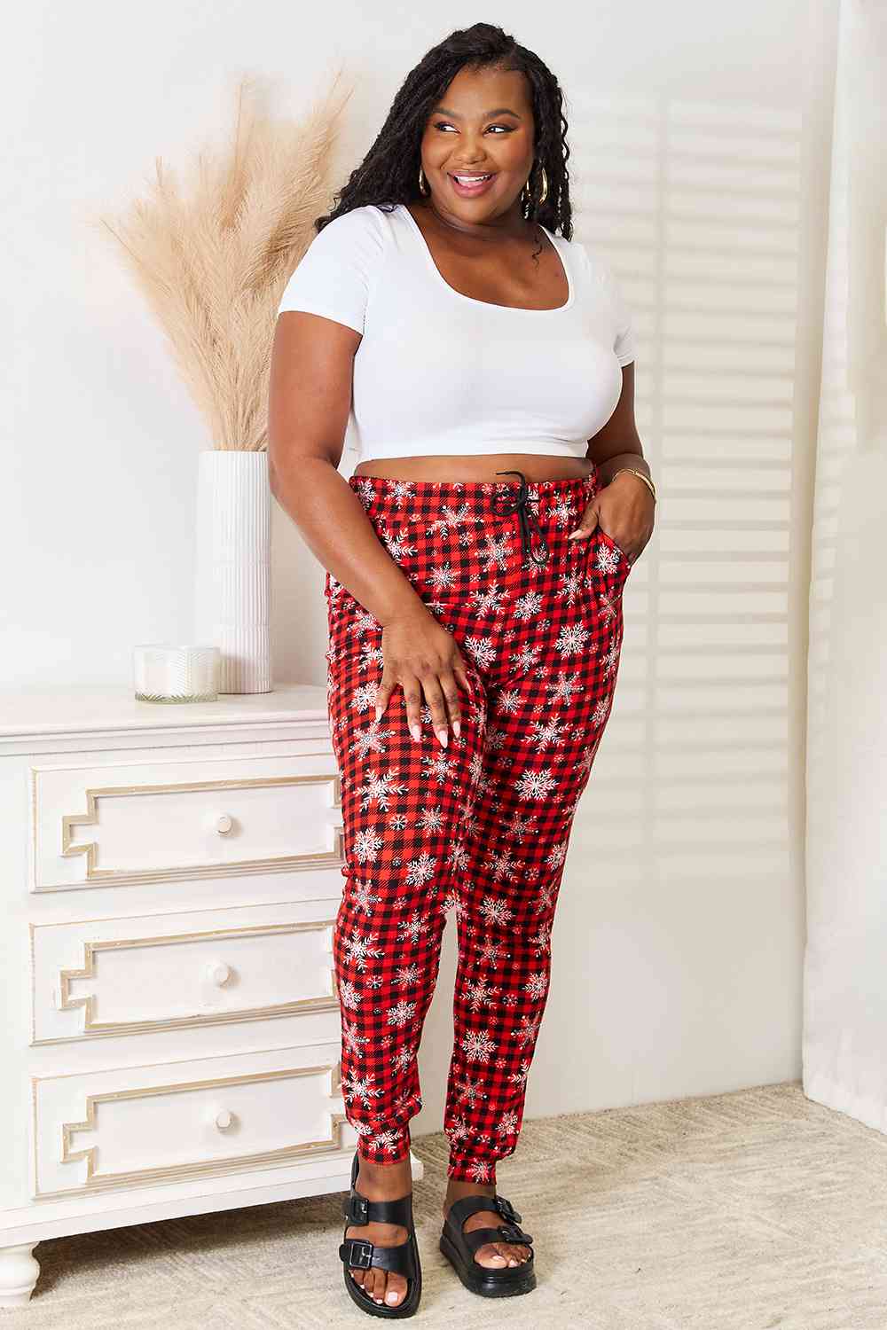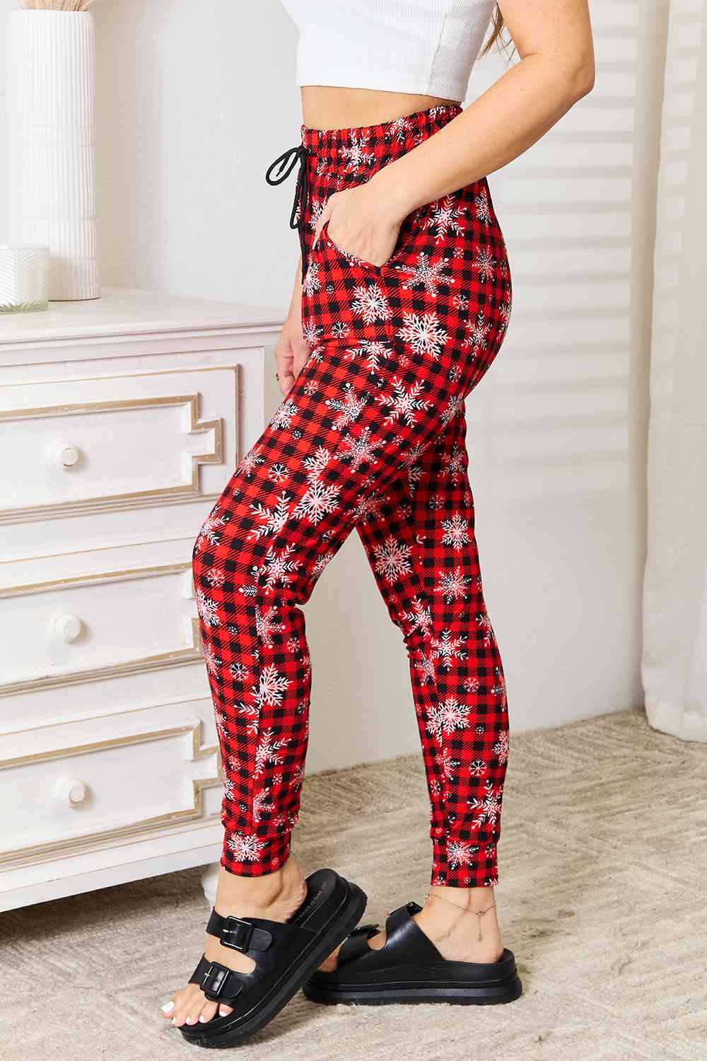 These joggers feature a delightful holiday-themed print that adds a touch of merriment to your wardrobe. The solid trim enhances the overall look, making these joggers suitable for both casual outings and cozy nights.