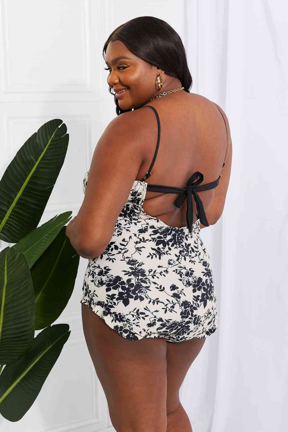 Vintage-inspired and regal, this toile floral one-piece features bows, a frill trim, and a sweetheart neck. The frill around the leg openings extends the cut for extra coverage. Adjustable straps and removable pads make this customizable for your body. Add a long kimono-style cover-up and a wide-brim straw hat to finish off your pool-day look.