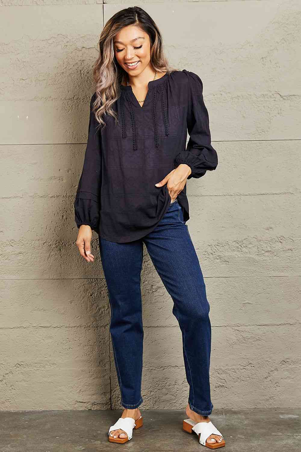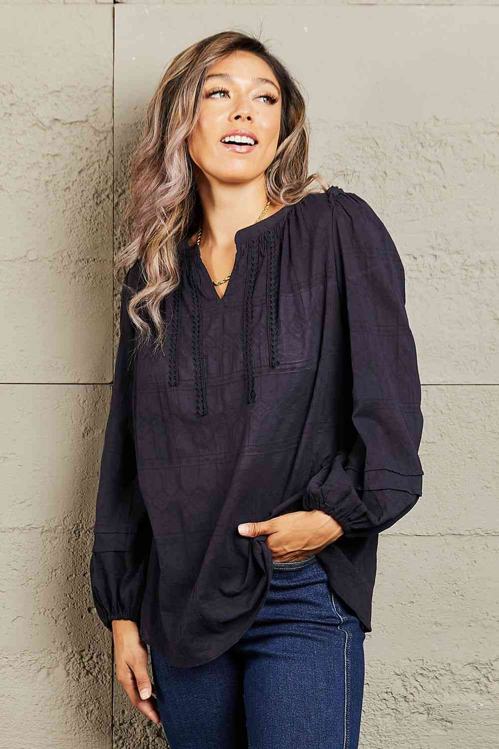 This blouse features a delicate front stitch pattern that adds a touch of sophistication to any ensemble. The lightweight fabric drapes beautifully, ensuring effortless movement and breathability throughout your day. Whether it's a professional setting or a casual outing, this blouse effortlessly blends style and comfort, making it a versatile addition to your wardrobe. Elevate your fashion game with this timeless piece that exudes charm and refinement.