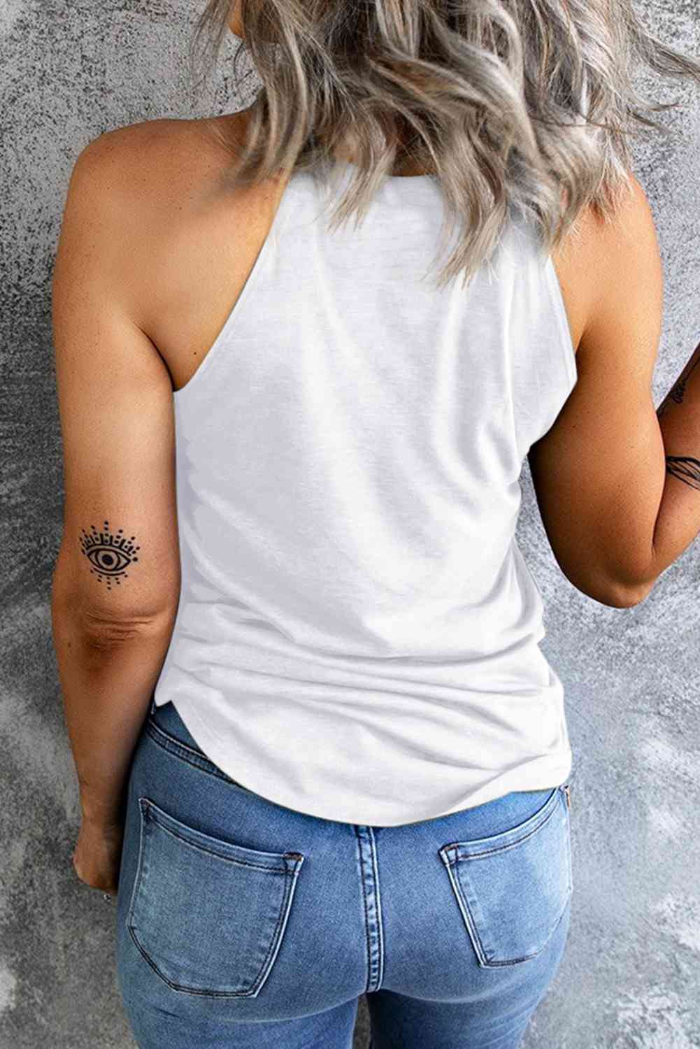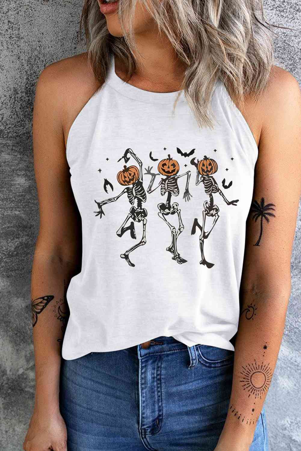 This round-neck dancing pumpkin head skeleton graphic tank is a good choice for Halloween or any festive occasion. The graphic pattern features a dancing pumpkin head skeleton, adding a playful and fun touch to the tank. The round neck neckline adds a classic and comfortable feel. With a regular length, it offers a versatile and flattering fit. Dress up in style and embrace the Halloween spirit with this eye-catching and festive tank.