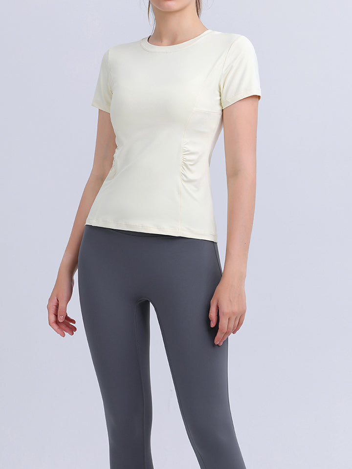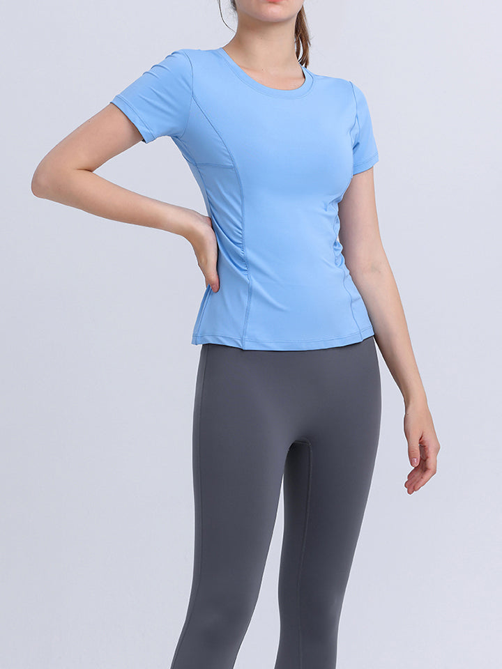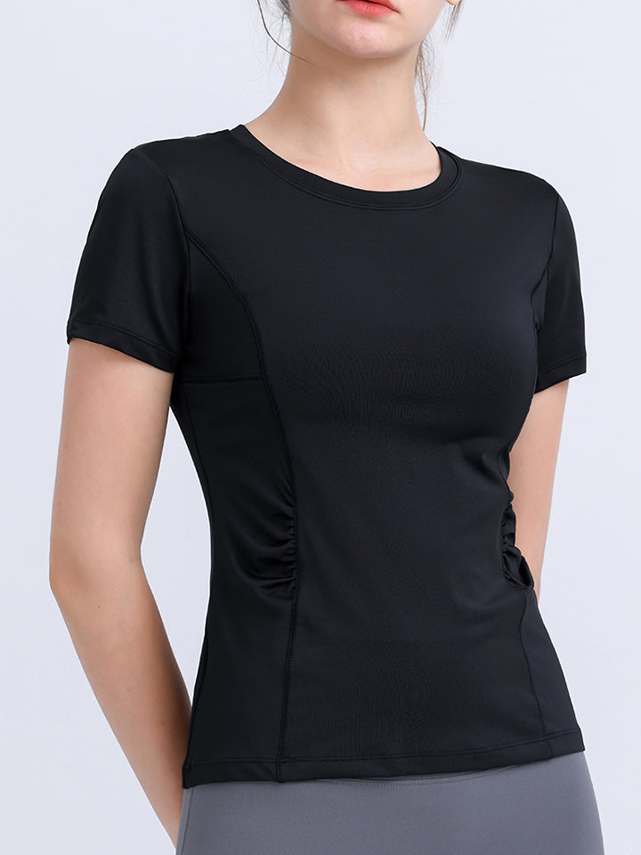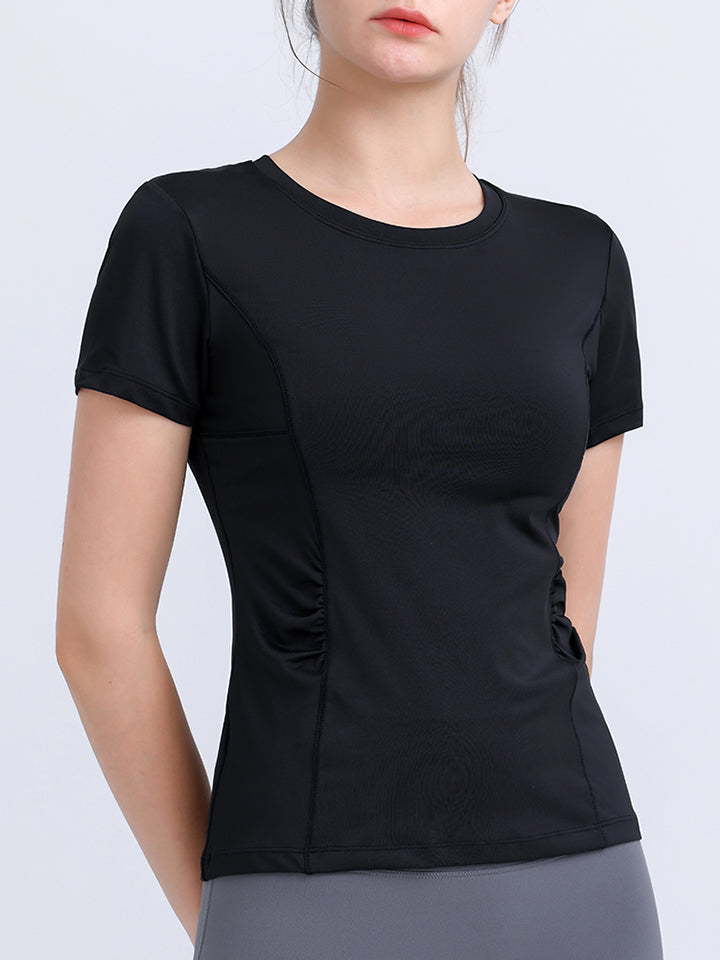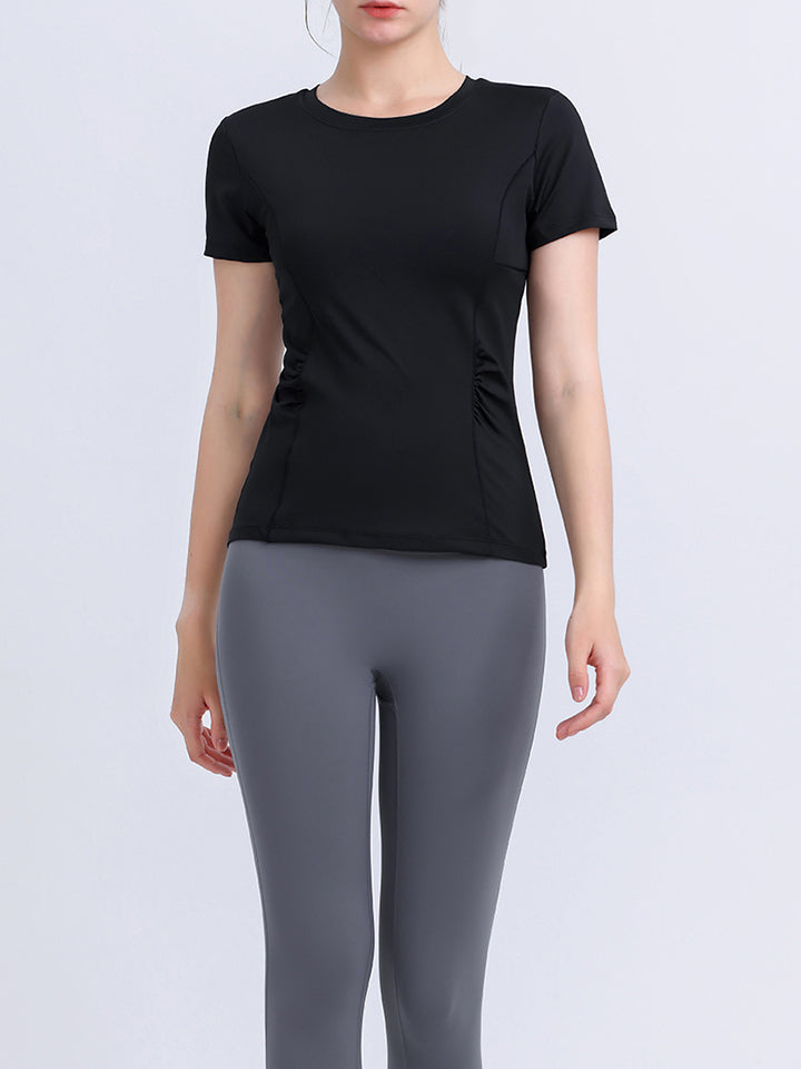 Chest pad: No padding Activity: Fitness Pattern type: Solid Style: Sporty Features: Ruched Neckline: Round neck Length: Regular Sleeve length:...