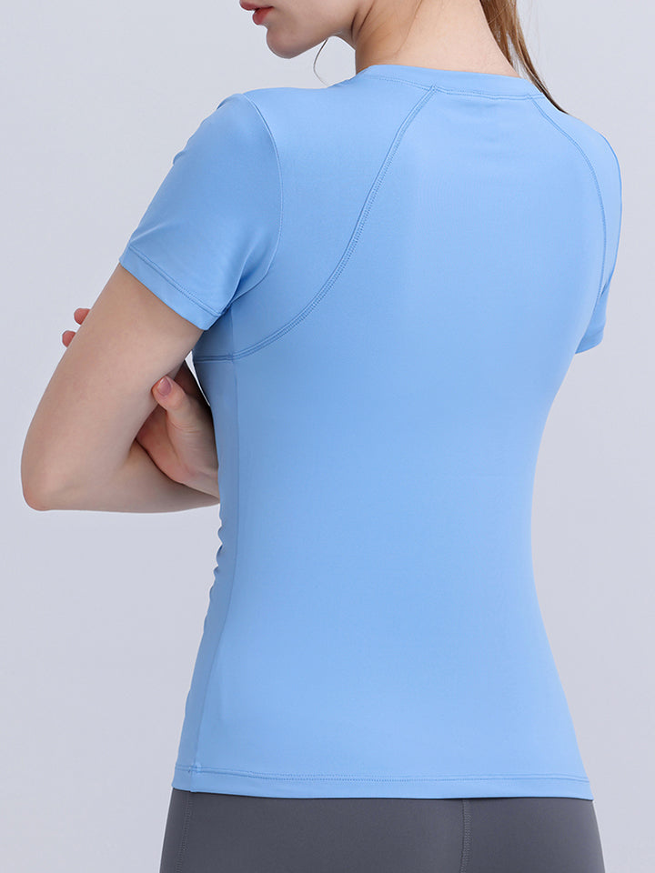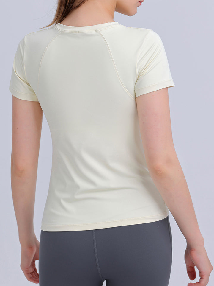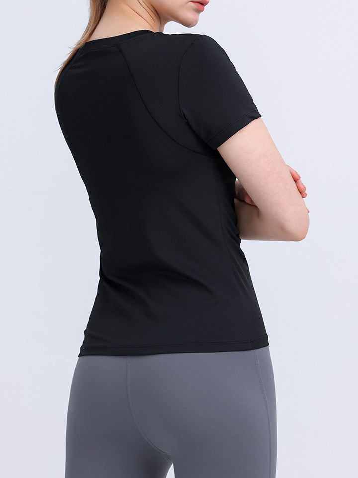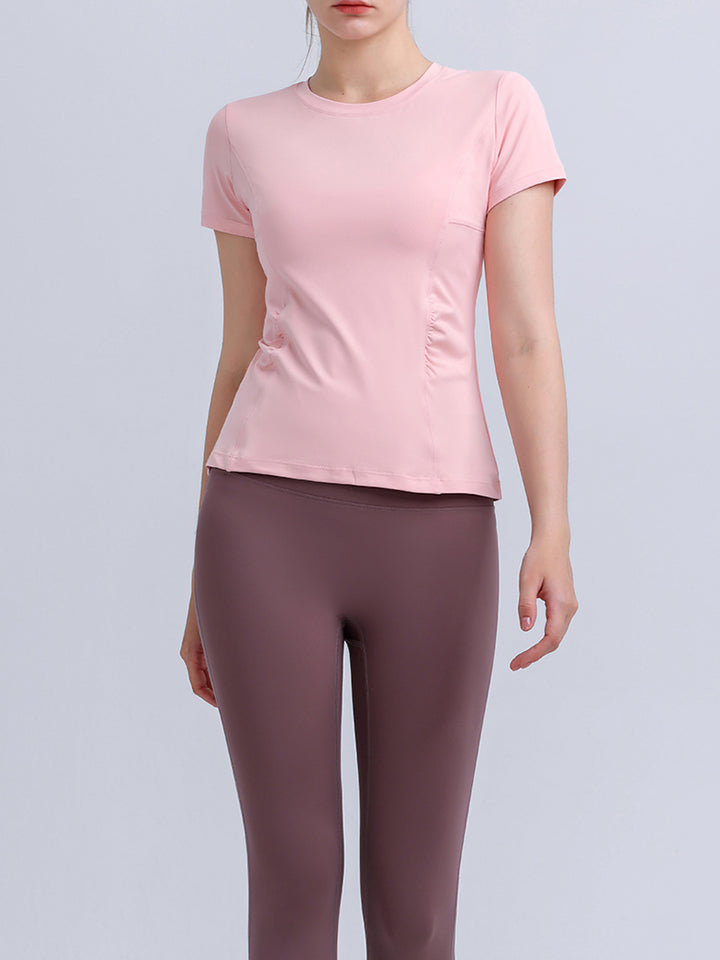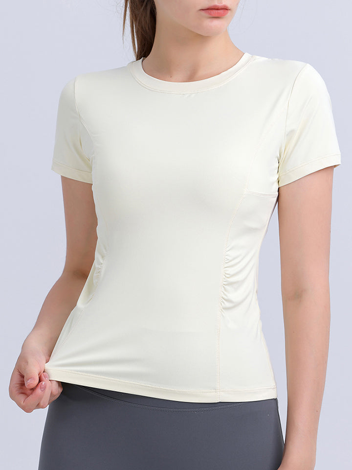 Chest pad: No padding Activity: Fitness Pattern type: Solid Style: Sporty Features: Ruched Neckline: Round neck Length: Regular Sleeve length:...
