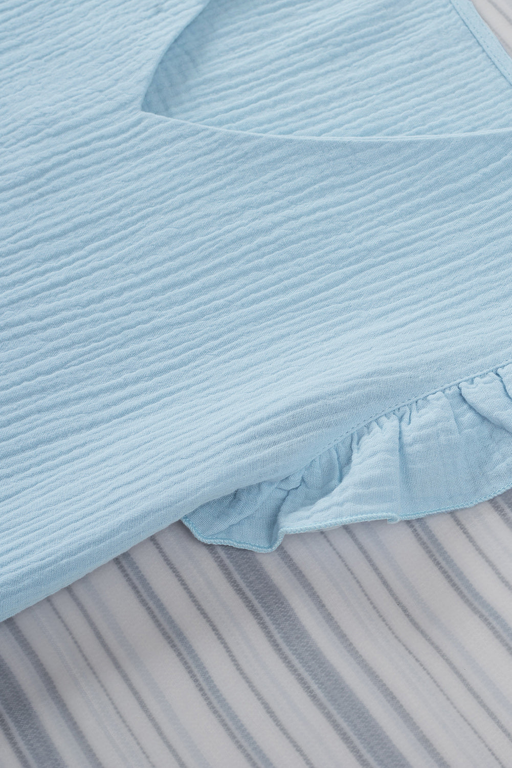 Sizing category: Regular Picture style: Outdoors Pattern type: Solid Style: Chic Features: Ruffle Neckline: V-neck Length: Regular Sleeve length: Cap...
