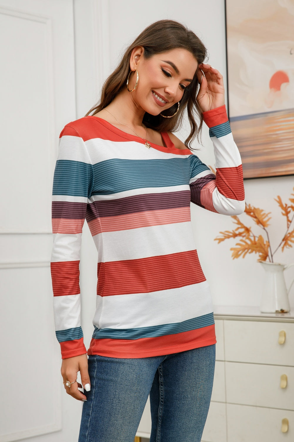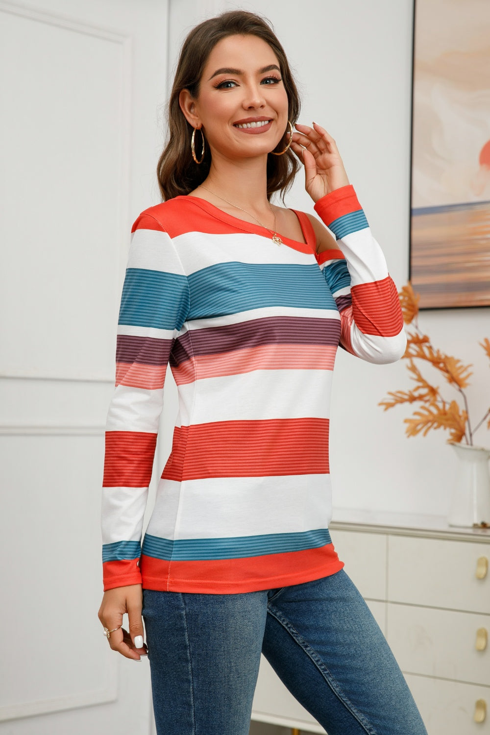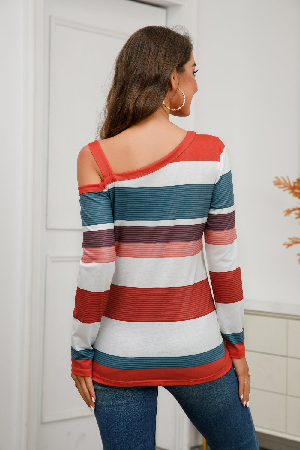 Striped Asymmetrical Neck Long Sleeve T-Shirt