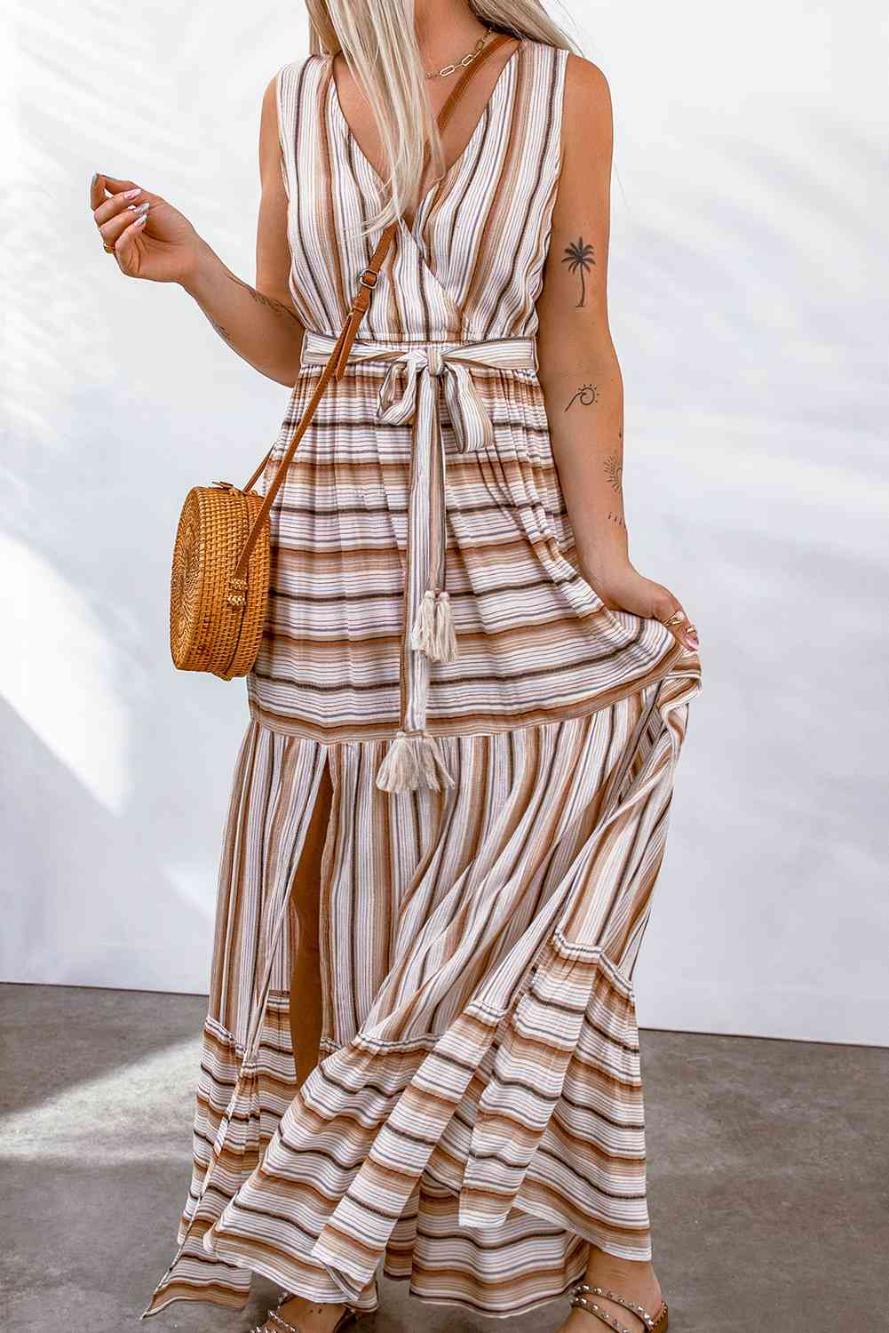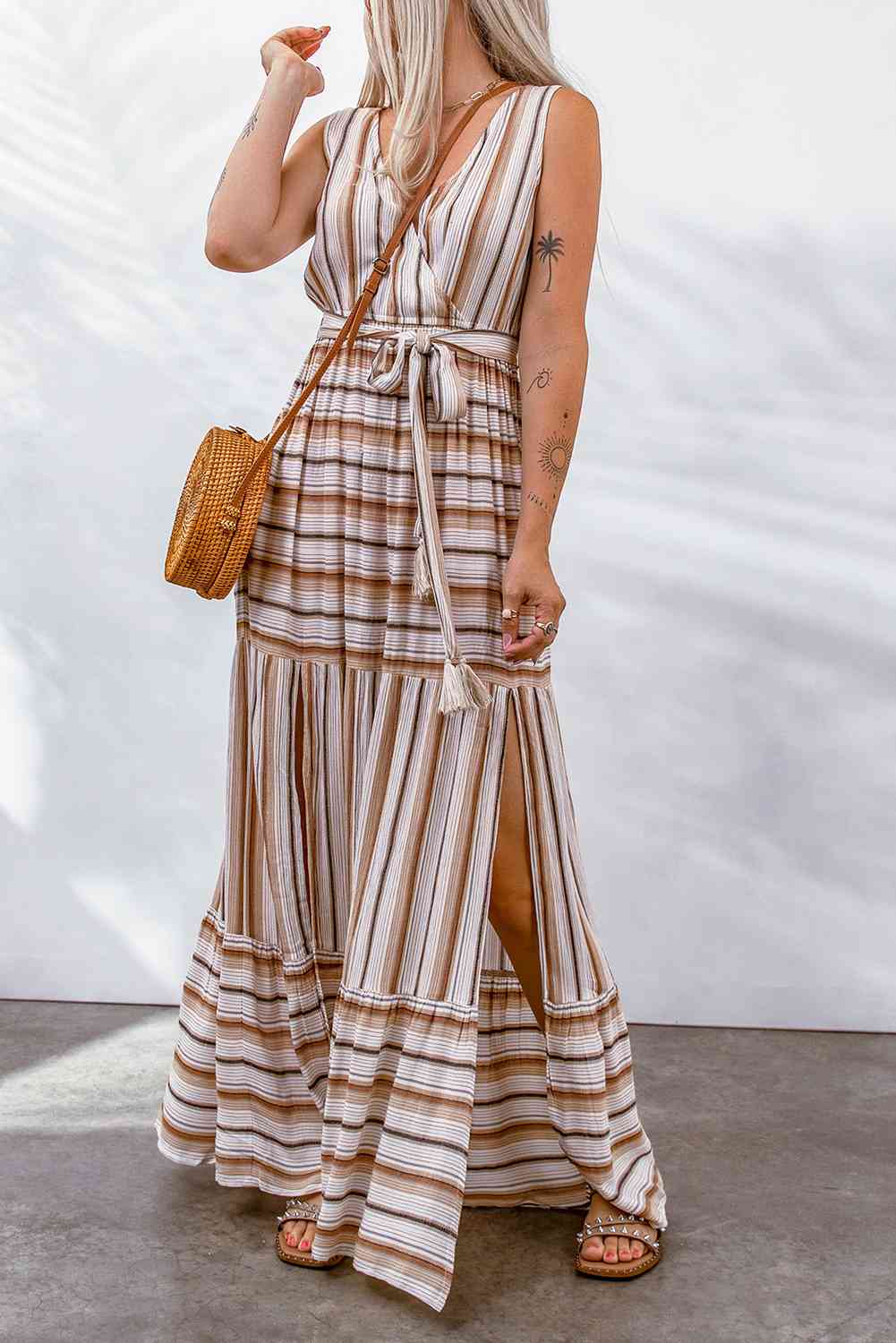 Pattern type: Striped Style: Casual Features: Tie, Split Neckline: Surplice Length: Maxi Sleeve length: Sleeveless Sleeve type: Sleeveless Hem shaped:...