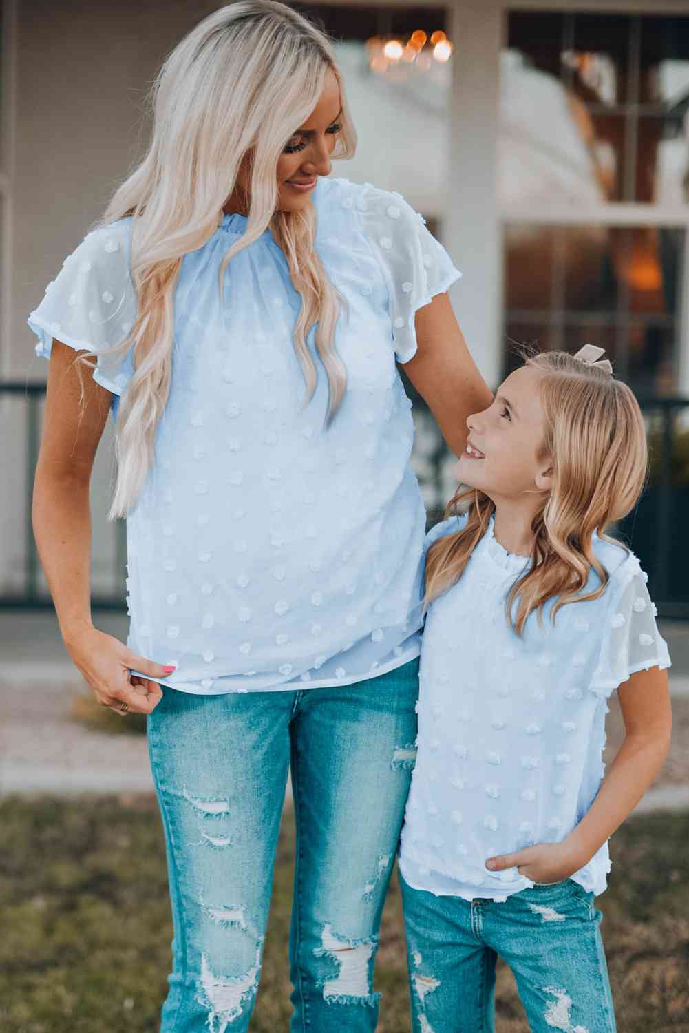 Women Swiss Dot Frill Neck Flutter Sleeve Blouse