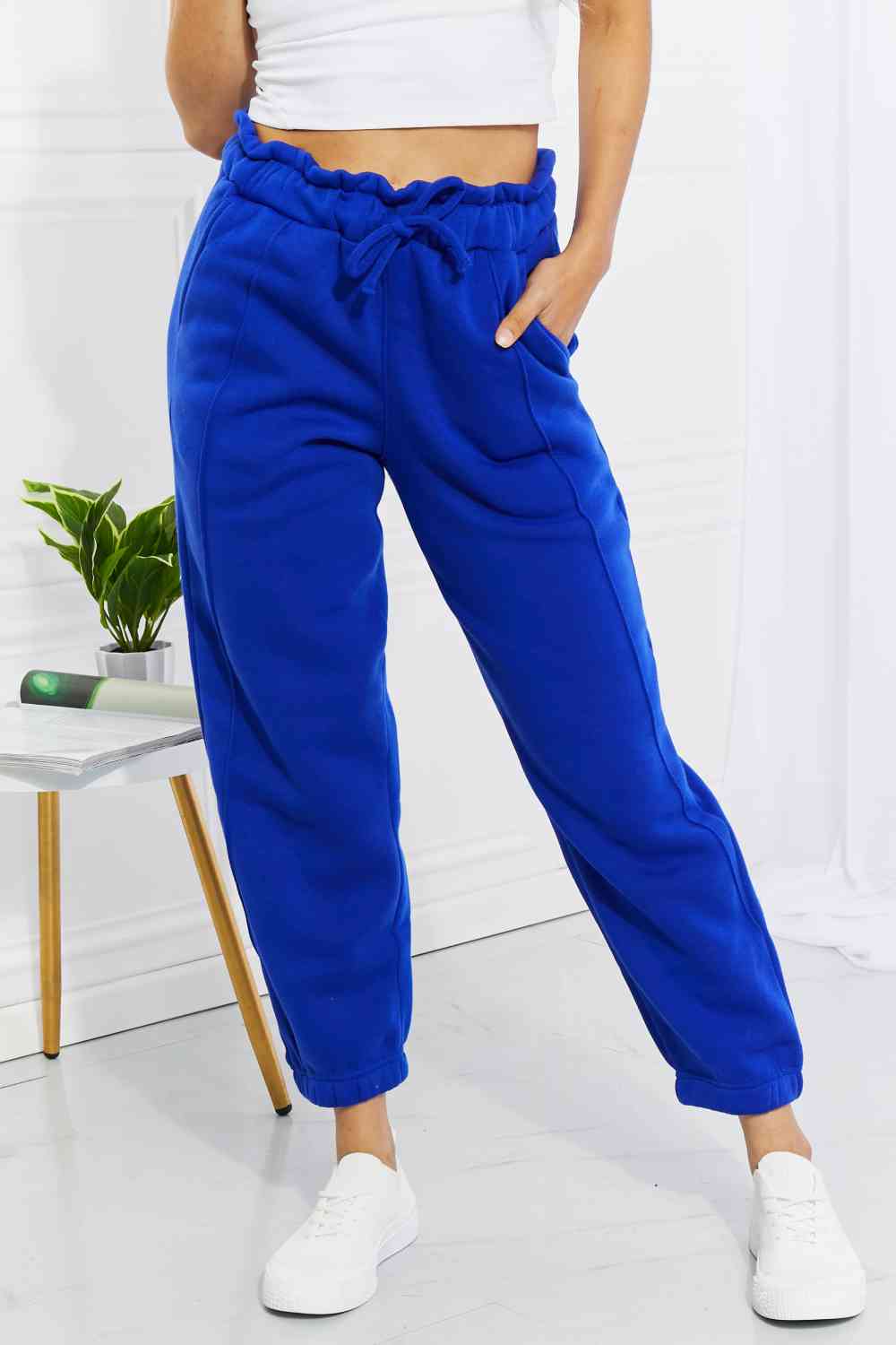 Give your favorite joggers a makeover by adding a paperbag waist detail. In a bold and beautiful blue, these comfy joggers feature a high waist and elasticized hems. For errand-running, add a tucked-in tee, denim jacket, and sneakers.If you're wanting to stay at home, a cozy sweater and your favorite slippers will do.
