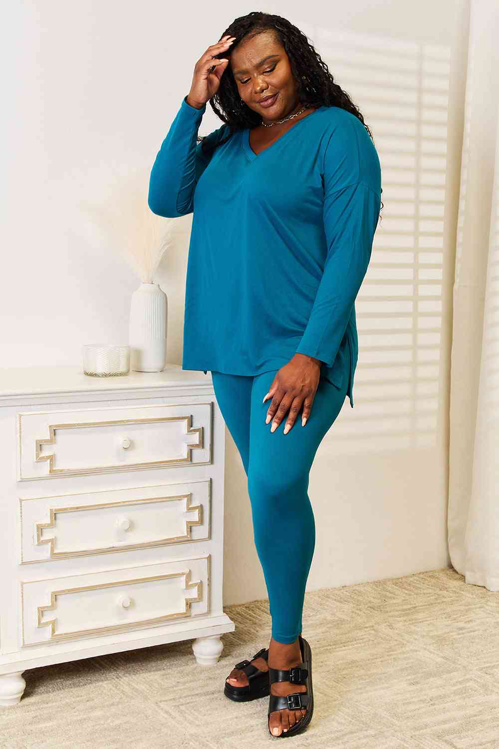 This loungewear set offers a buttery-soft touch that will make you feel like you're floating on clouds. The perfect stretch and recovery of the fabric ensure a flawless fit that moves with your body, providing unrestricted comfort for all-day wear. Whether you're lounging at home or out and about, this set guarantees an unmatched level of coziness and elegance, making it a must-have addition to your wardrobe.