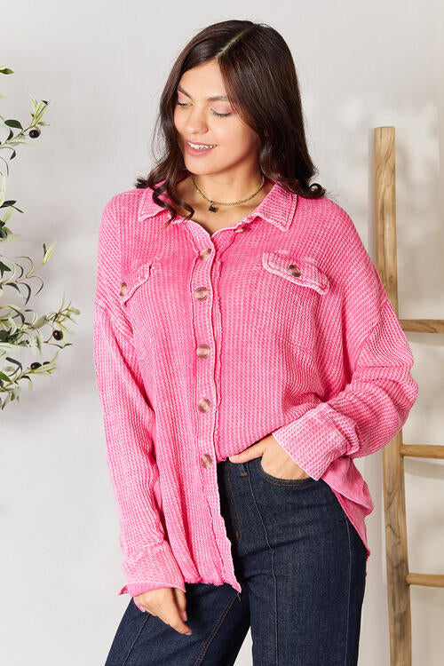 Zenana Waffle-Knit Button Up Collared Neck Shirt