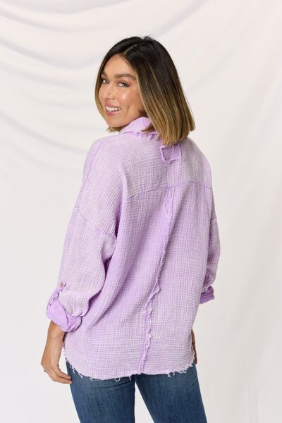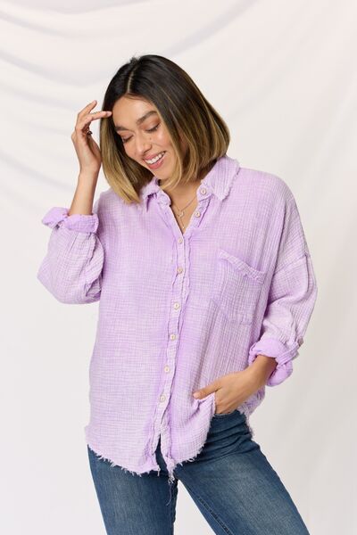 The Washed Texture Button Up Raw Hem Long Sleeve Shirt is a trendy and versatile addition to your wardrobe. Made with a textured fabric, it adds a unique and stylish touch to your outfit. With its button-up design, it offers a classic and timeless look that can be dressed up or down for any occasion. The raw hem detailing adds a touch of edginess and modernity, giving the shirt a cool and effortless vibe. Whether paired with jeans for a casual day out or dressed up with trousers for a more polished look, the Washed Texture Button Up Raw Hem Long Sleeve Shirt is a must-have for adding a touch of style to your everyday outfits.